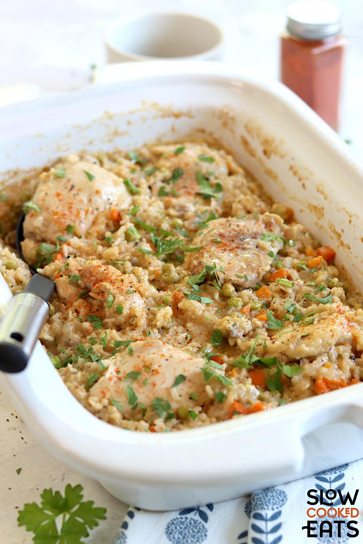 Slow cooker chicken thighs and rice is easy to make it your own with a few different swaps or additions.