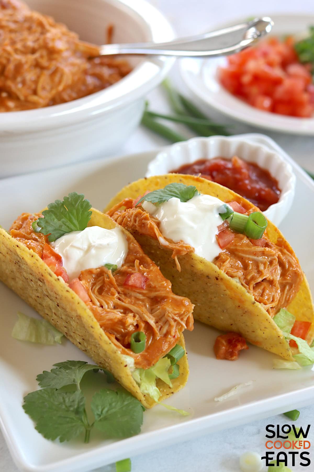 Slow cooker queso chicken tacos are best served warm and loaded up with toppings so everyone can build their own perfect taco.